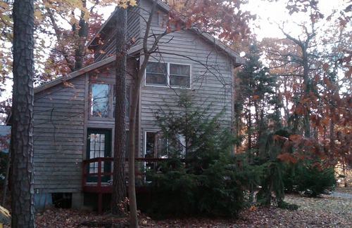 Beautiful split A-frame on wooded property, 13 min S of Rt. 1 leading into Rehoboth Beach, Lewes, Dewey, available for weekend, weekly rentals. (Beach towns are roughly 20-25 minutes away.) Two-bedrm plus loft (2 double beds, 1 double futon, 2 twins), 1 bath, 2 decks. Mature dogs considered on a case-by-case basis for extra fee; must have proof of age/vaccinations, crate.
