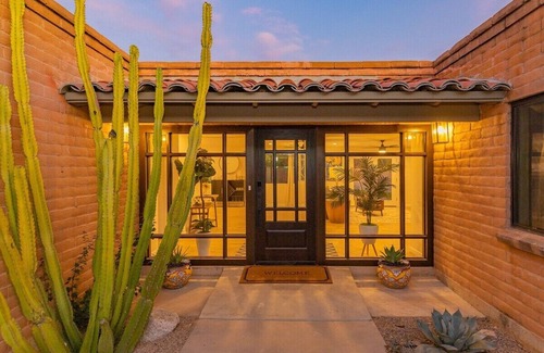 Sabino Velo Fully Furnished Luxury Tucson Vacation Rental Sabino Velo is a classic 1973 Tucson slump block constructed home on the outside which has been completely remodeled on the inside. The entire interior contains all new furnishings and appliances and features a Mid Century modern theme. This unique home features four bedrooms three of which are well-appointed with queen beds, and the fourth bedroom has a double bed. The Master Bedroom has a private 3/4 bathroom and the other three bedrooms share a full bathroom. There is also a half bathroom near the kitchen. Air mattresses in the closets allow another 3 or 4 children to sleep in the living room. The home has a large backyard with heated pool, brand new 6 person hot tub, and a built in grille and a fire pit to take advantage of Tucson’s year-round outdoor living. The home’s 2 car garage comes complete with a fully stocked bicycle shop. This home comfortably accommodates up to four couples sharing a residence during their trip to Tucson. Sabino Velo include a desk with computer monitor with HDMI cable and remote keyboard/mouse making this home and easy choice for those needing to work remotely during their stay. This home is equipped with Comcast’s 1 Gigabyte high speed internet offering you the fastest WIFI available in a vacation property in all of Tucson! For fellow cyclists looking to set up base camp for training, this home is located 4.5 miles from Catalina Highway which takes you up Mount Lemmon, Tucson’s premier climb with 7,000’ of climbing . For runners, Sabino Canyon Recreation Area is 4 miles away which offers excellent trail running and hiking. Whole Foods, Trader Joe's, and many of Tucson's premier restaurants are nearby, as well. Text as much or as little as you want throughout your stay, we are happy to answer questions about the property and the area to make sure you have a great experience at our home while visiting Tucson! Looking for a home for your wedding/graduation party/celebration of life event? Look no further, we allow events at our homes and have hosted several at this property!
