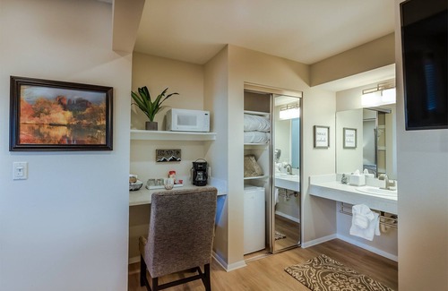 (230 sq ft) This comfortable suite offers a California King sized bed and contemporary en suite bathroom with walk-in shower, mini-office area, a coffee nook area which includes a small refrigerator, microwave, and coffeemaker.