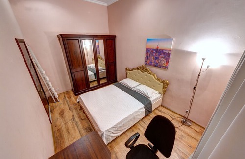 The entrance hall meets truly luxurious, there is a fireplace and a sofa. Each of the bedrooms has its own special character. The first has two beds - double and single. In addition, there is a chest of drawers, two bedside tables, a mirror and a four-door wardrobe, two doors of which are mirrored. The second bedroom has a truly royal bed with Versailles decoration thanks to monograms and gold. A work desk and a four-door wardrobe with a more mundane look slightly set off the luxury of the bed. The third bedroom has a chocolate accent wall, an ivory double bed, two bedside tables, a rocking chair with a pouffe, a chest of drawers with a mirror, air conditioning and a wardrobe with mirror inserts. The living room impresses with its splendor: a furniture set consisting of a sofa and two armchairs to match it, a double bed, a chest of drawers, a coffee table, a plasma TV, air conditioning, a pouffe and a dining table - these are its components. A large designer kitchen in coffee and chocolate color with a large number of shelving, light colors of the floors, the height of the ceilings and windows smoothly and harmoniously fit into the interior of the kitchen. From home appliances there is: - gas stove with oven; - microwave; - Electric kettle; - fridge. In some bedrooms, there is an exit to the balcony from which there is a pleasant view overlooking the city. The bathroom is equipped for the convenience of guests: - bathroom, hidden for convenience in a niche - washing machine; - a mirror with illumination; - laundry basket; - boiler.