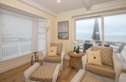 This newly renovated Sand Dollar Beach House has welcoming details! When you walk into this beach home you're greeted by four sliding glass doors that look out to sweeping views of the ocean. The upscale kitchen has a mosaic tile backsplash and the soft yellow and blue accent colors that run through the house bring the feel of the beach indoors.