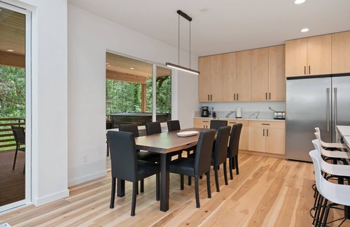 Message me to match with a house that has the dates you need available, or search for Sandy River Group Getaway. Created as the ultimate vacation rental, this house features a stunning kitchen, a massive master bedroom with soaking tub, two upstairs suites with full baths, one bedroom downstairs, and a bunk room with 8 twin beds. All the woodwork and much of the furniture was hand built from wood harvested from the property. The 700 sq ft covered deck features a hot tub, BBQ, outdoor dining table, and tons of seating.