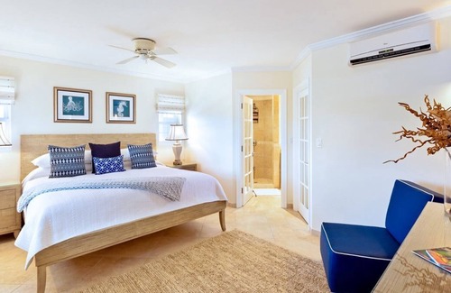 The master bedroom is en suite with a king size bed and furnished with pops of ocean blues and a fabulous sliding door with vistas out to the Caribbean Sea! The second bedroom also has a king bed and en suite bathroom with dual vanities. Twin beds furnish the third bedroom with a third bathroom conveniently adjacent. All rooms are air conditioned with ceiling fans.