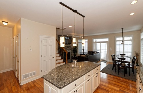 The kitchen, dining and living room, and ½ bath are located on the first floor; a beautiful open space with natural light where you can prepare your meals, dine, and sit on the cozy couch around the gas fireplace to watch TV or relax with a cup of coffee.