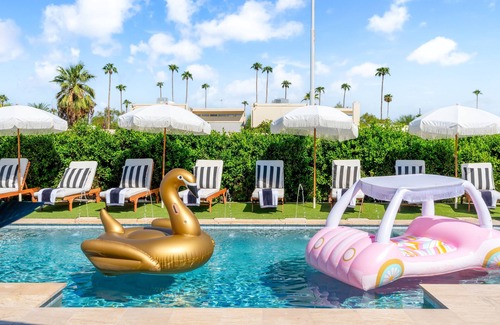 Your stay at The Scottsdale Diamond comes with a plethora of entertainment options, including a heated pool and spa with a Baja Shelf, water features, and a custom swim-up pool bar. Enjoy beach loungers and day beds, mini-golf with provided golf balls and putters, bags, giant Jenga, ping pong, and a lighted sport court featuring black light Pickleball and a half-court basketball. Two fire pit areas, a front courtyard, and a custom-built pergola with an outdoor dining table provide additional spaces for relaxation and socializing.