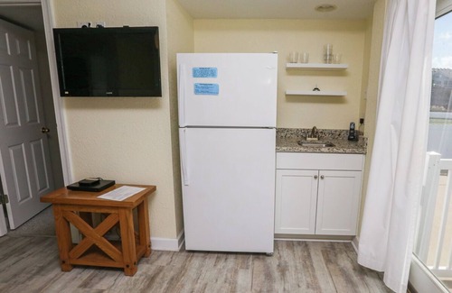 Den with 32” TV/DVD player, PlayStation; small kitchen area with full size fridge with ice maker and sink; bedroom (with Pyramid bunk and full bath with tub and shower).