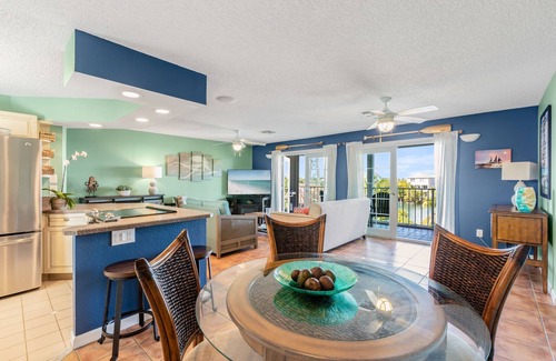 This quintessential island retreat is located on the 3rd floor of the complex, possessing a Key West vibe as soon as you step through the front door with tropical views all around. Find a spacious Great Room with an updated and fully equipped kitchen, featuring stainless steel appliances perfect for serving up your home-made meals to enjoy at the dining table for 4 or casually at the breakfast bar for 2. Settle into a good movie with comfy living area furnishings, a flat screen TV and 2 sets of French doors that can be perched open for sultry island breezes. Tile flooring and ceiling fans throughout keep this space airy and cool.