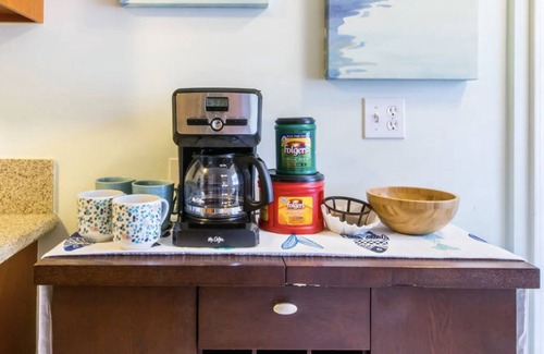 Ocean-facing private patio with grill and seating. Fully-equipped for a perfect getaway. Parking included.