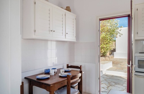A spacious seaside apartment built in classic cycladic architecture with a spectacular view out to the sea from the patio. Located a stones throw away from Kolimbithres, offering a unique bathing experience among the granite rock formations. There are numerous other bathing areas within walking distance. Here you can relax with the whole family at this peaceful, picturesque place to stay and be right next to the town with its amenities.