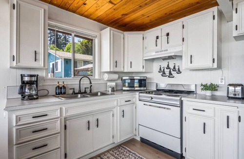 This bungalow features two cozy bedrooms; the primary bedroom has a queen bed, and the 2nd bedroom has two twin beds. All beds are made up with comfy linens and extra blankets, perfect to help you wake up refreshed and ready to take on another day of adventure! The shared bathroom is equipped with all the amenities you need to freshen up, including towels, body wash, shampoo/conditioner, hand soap, hair dryer, Q-tips, and cotton rounds. The kitchen is fully stocked with utensils and bakeware to make your meal prep a breeze!