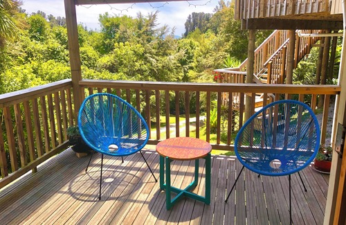 This stylish pole house is sunny, comfortable and welcoming. It has an open plan living area with big slider doors opening onto a large deck with beautiful views of the sea framed by giant rata trees. Built on a limestone outcrop it is tucked away and feels very private. It has two bedrooms inside and a sleep out next to the house. Only 5 minutes walk to Pohara beach, a great base to explore Golden Bay from. Enjoy relaxing on the deck, listening to birdsong and watching the sunset and sea views.