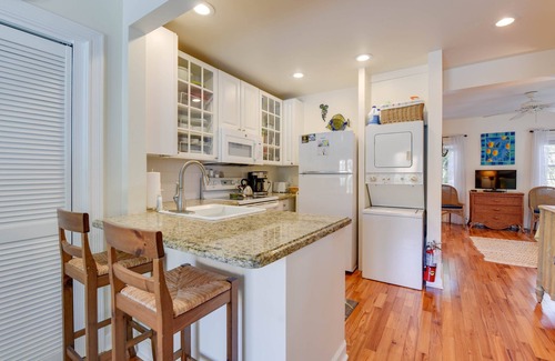 The kitchen is white with granite countertops and is fully equipped with all the things you need to cook a great meal during your stay. While one of you cooks, the other can sit at the kitchen counter bar and share a glass of wine. The dining area, with a glass top table, has four chairs to accommodate you and your guests.