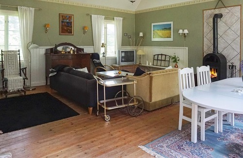 A fantastic spacious house in secluded location but close to the E4 makes this house easy and convenient to reach for the vacationing family or company. The house, which was once an old mission house, is nestled in greenery, and completely separated from neighbors as it is the only house that the small leafy forest road leads to. You are greeted by a large lawn in front of the house that invites you to play and socialize. Here you also park the car (s), so loading and unloading goes incredibly smoothly! To a bathing lake you take five minutes by car, and good parking space is available. Once there you are met by a fantastic well-kept swimming spot, with h-jetty, sandy beach, kiosk and a small playground. There is also a lake for fishing nearby, to which you can easily buy a fishing license! To the left when you enter the house you will find the house's spacious, L-shaped and well equipped kitchen where the whole family / company can stay together at the same time. There is a dining area for everyone without being cramped while preparing meals together. Simply a lot of space to hang out at! From the kitchen you reach the bathroom which is equipped with a practical shower cubicle, and like the kitchen is large. Straight ahead in the hall you are greeted by the stairs up to a large and spacious bedroom which is equipped with a double bed. To the right of the hall you enter the heart of the house, the large hall. Here you can see clear signs that the house was once built to be a mission house! The living room is furnished for socializing and well-being, and even here there is a large table to sit at o eat a good meal together, or why not have an ongoing board game? Due to the fact that there is also a large kitchen table, not everything needs to be removed before every meal! From the living room you reach the other bedroom of the house which is equipped with double bed. You also reach the annex with the stairs up to the other two bedrooms, a room with a small sleeping loft equipped with a 1.40-bed space and a bedroom with another double bed.