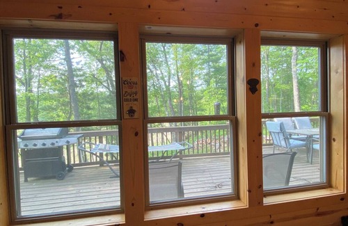 Very private cabin with wilderness views on the east end of little round lake. The cabin does have satellite WIFI. 2 bedrooms (king and queen) with a spiral staircase leading up to a loft with another queen bed. Full bath on the main floor and a half bath in the loft. Open timber frame design. Main level has heated floors and a gas fireplace.