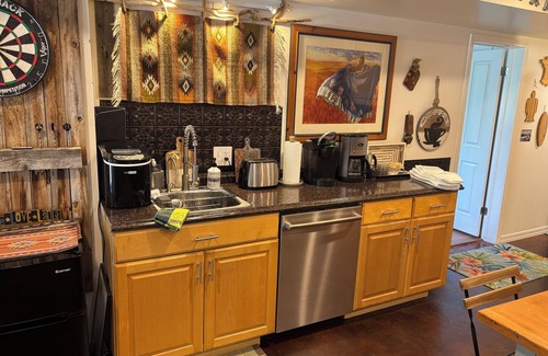 The kitchenette is fully stocked with a coffee maker, a Keurig, a tea brewer, blender, pots, pans, toaster, dishwasher, microwave, medium-capacity Kitchenaid oven, dual burner, smart-touch induction burner, 2 dorm refrigerators, ice cream maker, toasted sandwich maker, automatic rice cooker and hopefully anything else you need. KITCHEN STAPLES: We provide Coffee, Tea, Hot Chocolate along with Olive Oil, Vinegar, Salt & Pepper, Sugar, Ketchup, Mustard, Mayo, and Maple Syrup. We like to cook and likely have what you're looking for.