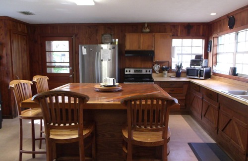 Our lodge has natural and country decor throughout and Cedarwood/cypress dress most of the walls. Inside dining table will seat 8 easily. Kitchen island sits 4. Outside there's a screened in porch with table to sit 6, spacious dock(4 stairs to climb) overlooking haw creek, campfire pit w/swing, and small boat ramp. We are 2 miles off the hard top and completely in the middle of the woods where you can experience nature at it's best. If you listen at night you can usually hear owls talking. Fully stocked kitchen: cooking utensils, pots/pans, usual condiments, and Culligan drinking water. There's also a couple family games and a house set of croquet.