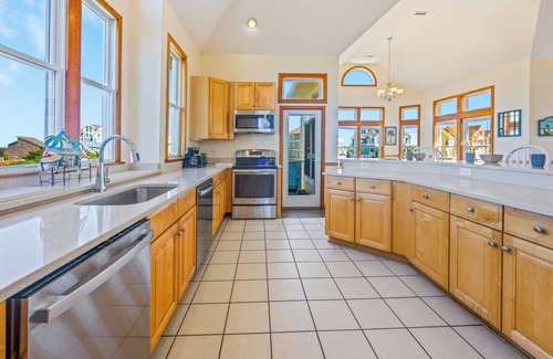 The great room features high vaulted ceilings and lots of windows to bring in the sunshine and pretty views. Gather around the large flat screen TV home theater system to watch your favorite streaming shows. The dining table is surrounded on three sides by tall windows with a blue ocean view to the east. Meals are easily prepared in the well-appointed kitchen that offers a breakfast bar, lots of counter space and dual dishwashers for quick clean-ups. Fill your cooler for the beach at the ice machine. Sit back and enjoy the sea breeze and water view on the expansive deck with picnic table perfect for after-dinner ice cream parties. If you are planning a visit to Hatteras Island, plan to stay at OCEAN ISLE.