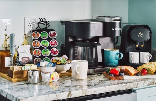 ☕ Coffee bar includes: Keurig, Nespresso, and drip coffee maker, with enough for everyone’s first cup!
