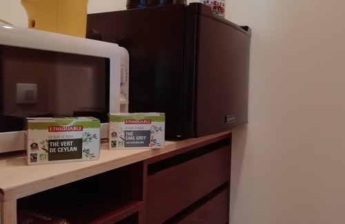 The kitchenette is equipped with a stovetop and a refrigerator, as well as a coffee maker, an electric kettle, and a lobster pot. Bathroom amenities include a hair dryer, a bidet, and towels. Other amenities include bed sheets, heating, and a dining table.