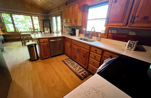 while enjoying the large flatscreen TV with Roku for streaming your favorite shows. The inviting interior features wood floors, cabin-style décor, and charming touches that blend rustic warmth with modern convenience.