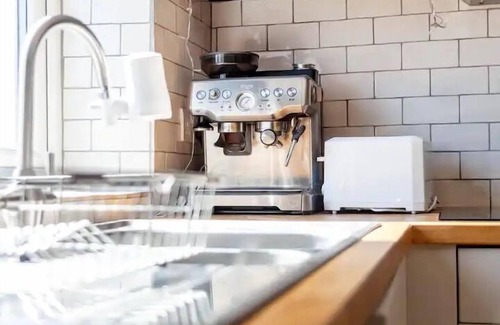 This modern kitchen has everything needed for good coffee, cooking, entertaining, and family life