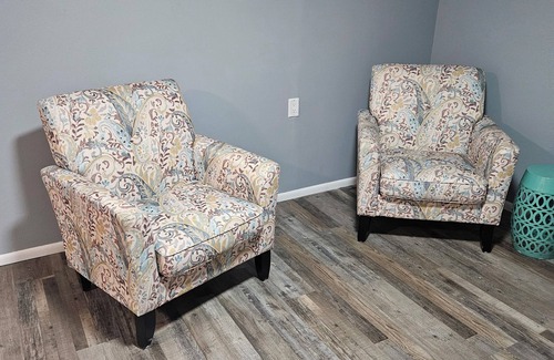Upstairs there are three bedrooms, one full bath and one half bath. The half bath is in the larger of the three bedrooms. Two of the bedrooms have queen beds. The other bedroom has a bunk bed with a full bed on the bottom and a twin bed on top. The living room has an electronic reclining couch, with built in usb chargers, to sit down and relax on. The kitchen is fully furnished and ready for your cooking needs.