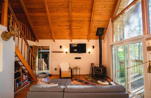 This cozy 1 bed + loft lake cabin is great for couples or small families who enjoy the outdoors! The bedroom features bunk beds for littles to snuggle down at bedtime. The loft features a mid-century modern Queen bed for the grown-ups. The décor is a mix of new items for your comfort + vintage finds. Basic kayaks, inflatables, and life jackets are provided for fun on the water! Sit on the deck or dock to enjoy the peace & serenity of this quiet, non-motorized little lake in the woods. 4 adult & 2 toddler-sized life jackets are provided. The kitchen is equipped with the essentials for preparing basic meals. Stacked laundry units in bathroom. The flat-screen TV can be used for watching DVDs/Blue-Rays or Netflix. The cabin now has fast, fiber internet service! NOTE: --Stairs to loft are steep and ladder-like, & are not recommended for anyone with balance or mobility issues. --Wood stove indoors & fire pit outdoors may be used only when no burn ban is in effect. Please exercise good judgment & take proper precautions with fire. --Lake is private & no lifeguard is on duty.