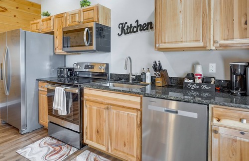 KITCHEN: Dishwasher, fridge, oven, 4-burner stovetop, microwave, island, breakfast bar w/ seating, Keurig coffee maker, toaster, Crockpot, cooking basics, dishware & flatware
