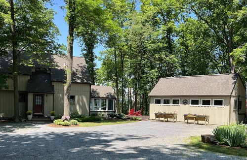 Enjoy nature at its finest on this 10 acre estate! Main house w/3 bedroom includes screen porch, modern kitchen, washer/dryer, large living room , wi-fi, & air conditioning. Detached game room sleeps additional 4 people while providing privacy from the main house. 3 decks overlook 245 feet of lake front footage. Rental has both gas and charcoal grills for your enjoyment. Bring your own boat or use the 2 two-person kayaks that come with your rental. Try a little yoga in our "Namaste" shed tucked in the woods. The perfect spot to relax & enjoy! Linens/towels provided. Washer/dryer on site for longer stays! Fish off the dock or float on the boogie boards . Plenty of hiking trails nearby, 30 minutes to Middlebury, 45 minutes to Burlington.