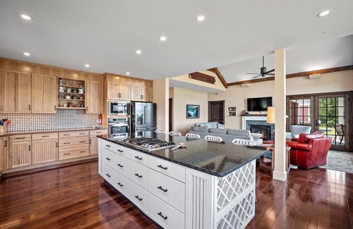 Experience a retreat that is equipped with central A/C, Wi-Fi, a chef's kitchen (fully equipped), spacious vaulted living room with charming gas fireplace, an office, a lovely farmers porch, and covered deck. The chef's kitchen has ample counter space, a 6-burner stove, large island for gathering, and connects to a spacious dining room that seats 12 people. The owners of Seven Gables Farm have four generations that enjoy the space together. The 1st floor offers a master suite (king) with walk-in closet, desk, and private bath; a private office, and a roomy laundry/mudroom. Although not fully accessible for mobility needs, the home is mobility friendly. Three steps up to the house with a sturdy hand rail. One step into the home. Once on the main level there are no steps except a step out on to the covered deck. The doorway to the master bedroom is 35” wide as is the door into the master bath. There is a small lip on the shower under the shower door. Grab bars are available for the shower and toilet areas. There is also a powder room/ half bath on the first floor providing privacy for the master suite. With four of the bedrooms having king or queen beds and private bathrooms, this is also a wonderful accommodation for four couples to share. Lots of privacy for everyone.