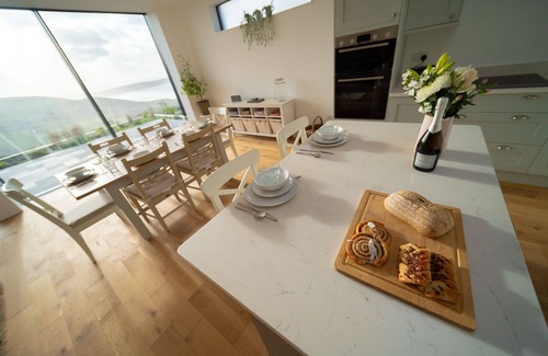 A modern holiday home with sea views overlooking Woolacombe bay, Croyde & Hartland in the distance. With high ceilings and ample natural light the ground floor is bright and spacious. The sea views from the open plan living room offer unrivalled views perfect for evening drinks or alfresco dining from your patio garden furniture. The modern kitchen and island makes for ideal family cooking to be enjoyed around the large wooden table infront of the sliding glass windows.