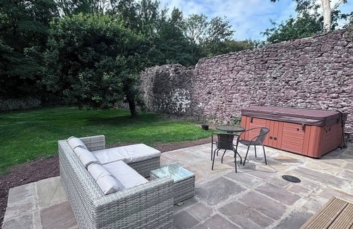 A cozy, rustic retreat perfect for couples in a partially walled private garden with an electric hot tub and outdoor seating.