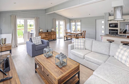 This is a stunning, two bedroom lodge with a super king-size bedroom with en suite, and one twin bedroom with en suite. Open plan kitchen, diner and lounge area, complete with French doors which open out onto a decking area, which finishes off with stunning country views. The master bedroom has patio doors which open up to the hot-tub.