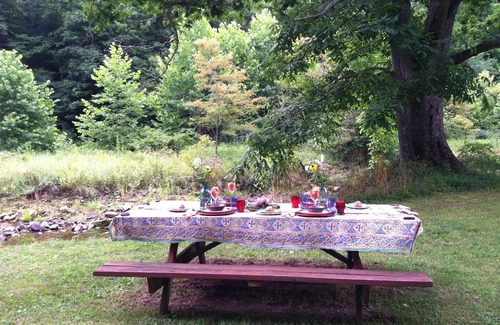 The tastefully decorated cabin includes a master bedroom with queen bed, a second bedroom with two twin beds, one bathroom with laundry, a fully equipped kitchen, open living/dining area with cozy wood stove, a covered porch and a deck with hot tub and outdoor dining area with a gas grill. At the Cabin on Back Creek, you can enjoy the stars which light up the night sky, bird-watching, walking, or just relaxing with a book in the hammock, on the porch, or on the deck. In the early spring, we make maple syrup at the sugar house located adjacent to the Cabin. You are invited to watch (and smell!) the process of turning 50 gallons of sugar water into a gallon of pure maple syrup - or you can help us if you would like!