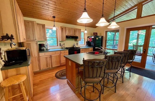 Tucked away in a serene wooded setting, this charming 2-bedroom, 2-bath cabin offers the perfect escape for families, couples, or friends seeking peace, privacy, and comfort. Surrounded by nature, the home features a spacious great room with vaulted ceilings, a cozy freestanding gas log stove, and comfortable furnishings—including a sleeper sofa to accommodate extra guests.