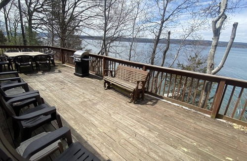 A short flight of stairs from our four-car parking area leads you to a wrap around deck. If you're able to tear yourself away from the view, the front door leads you into a bright, open great room. The beautiful eat-in kitchen opens to the living area with a full-size futon and a flat screen TV, with Netflix and a blu-ray player, complete with a wide array of DVDs for cinefiles of all ages. A closet full of games and books, help pass the occasional rainy day - or provide a welcome distraction after dinner before a night of campfire, S'mores and Riesling! Original hardwood floors have been refinished - bringing gleaming clean character to the home and huge picture windows with breath-taking panoramic lake views escort the outside beauty in. Two bedrooms, each with a queen size bed, join the pull out queen sofa in the living room in providing comfortable sleeping spaces for up to 6 adults!