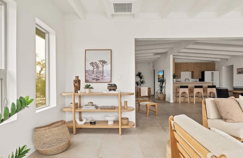 Welcome to Bartlett Ridge by The Cohost Company—a stunning hilltop retreat overlooking Joshua Tree, San Jacinto, and the Mojave. Soak in the hot tub, lounge by the pool, or gather around the firepit with unbeatable sunset views. This 1960s gem blends vintage soul with modern luxury and seamless indoor-outdoor living for the perfect desert escape.
