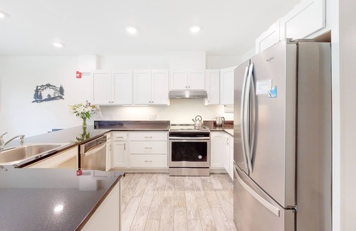 After full days of shredding fresh powder or hiking as you soak up sweet vitamin D, head back to home base and gather with loved ones in the open layout as smells of a homecooked meal waft in from the full kitchen. The culinary-inclined guests will be glad to know that the kitchen is equipped with stainless steel appliances, a coffee maker, a dishwasher, and plenty of cookware. And everyone can take their pick of gathering at the dining nook for meals or keeping it casual in the living room with a movie or show streaming on the flatscreen TV. Best of all, high-speed WiFi and Netflix can keep everyone entertained during downtime! Your all-season hideaway stays comfortable all summer due to the first-floor location and porcelain wood tile flooring.