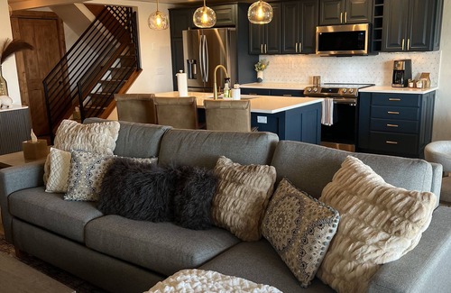 This unique 2-bedroom condo has two stories and features stunning mountain views. The spacious main floor living area is well appointed with a brand new top of the line comfortable sectional (sleeper) sofa, a leather lounge chair and ottoman, a 75-inch flat screen TV, reading lights and a cupboard full of family games to choose from. The large living room windows let in a ton of natural light and offers a spectacular view of Steamboat's iconic slopes and gondola, as you relax by the stacked stone gas fireplace. In this open concept lower level, you will find a fully stocked kitchen with everything you will need from cookie sheets, to multiple pans to cook that big breakfast in. We stock the kitchen with the extras such as tinfoil, baggies, salt and pepper, glass storage containers, and detergent to do a load of dishes. The dining area has seating for eight at the table where you and your family and friends can enjoy having meals or playing games for hours. In addition, there are three leather stools around a marble countertop. The bathroom located downstairs is an additional full bath to accommodate those extra guests sleeping on the hideaway or to provide that extra shower when everyone wants to rinse off after a soak in the hot tub!