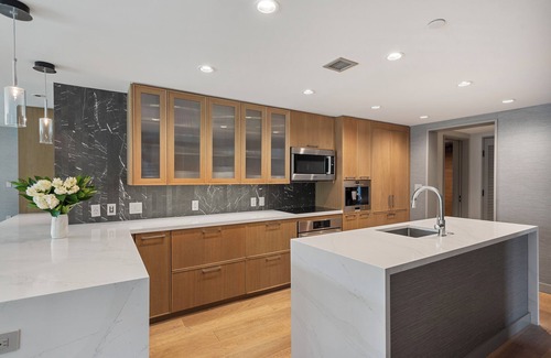 The dining area features a large sophisticated wooden table with room for 8 , illuminated by striking modern chandeliers, setting the perfect ambiance for intimate dinners or lively gatherings. The recently updated gourmet kitchen is a chef’s dream, boasting new high-end appliances, marble countertops, and a spacious island with bar seating—ideal for morning coffee or casual meals.