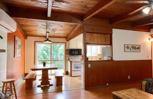 The cottage has wood beam ceilings and a stone fireplace, enhancing the wooded views seen from within. All you need to do to create a cozy, warming fire is adjust the gas fireplace thermostat- no wood, no mess. Step out of your dining room onto a private deck looking into your own property oasis in the mountains.