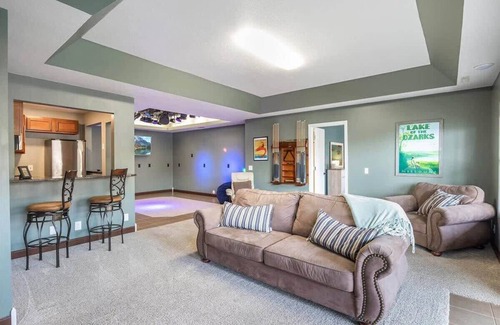 Welcome to our luxurious lakefront rental, where you can experience the ultimate vacation in style and comfort. This stunning home has everything you want for your vacation: family room with a dance floor, bar and pool table, private dock with swimming mat, 3 levels of living space, 6 bedrooms AND 7 full bathrooms! Less than 5 minutes to Bagnell Dam Strip!