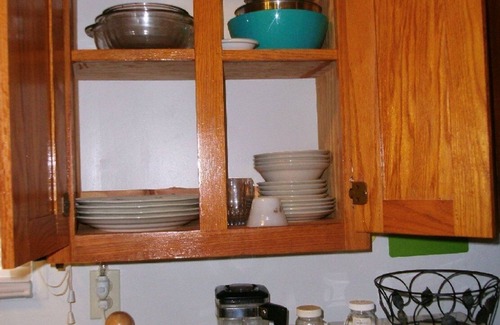 Among the amenities included are extra bedclothes for the full sized bed as well as bedclothes and pillows for the air mattresses. A hair dryer, a curling iron, a clothes iron and a tabletop ironing board are provided. Paper towels, facial tissues and toilet paper are provided. Bath towels, wash cloths and hand towels are provided. There are 2 umbrellas provided. The kitchen appliances are a coffee pot, a microwave, a crock pot, a toaster, a blender and a mixer. The kitchen is stocked with glasses, coffee cups, plates, saucers, bowls, paper plates, salt and pepper shakers, mixing bowls, canisters, cooking utensils, eating utensils, knives, pots and pans, iron skillets, non stick skillets, a cookie sheet, a hand juicer, measuring spoons, measuring cups and a strainer as well as dish towels, dish rags and kitchen hand towels as well as dish soap and scrubbers. A dish drainer is provided. For clean up, there is a mop, a broom, a vacuum cleaner and a stack of old rags. Bathroom cleaners are provided. There is also a air freshener/ionizer provided for people with allergies. There is no daily cleaning service.
