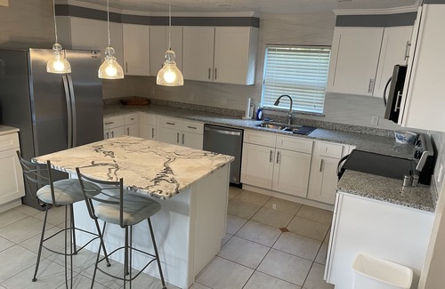The main house separates out perfectly for couples or families to enjoy. The first floor features a full sized kitchen, great room with flat screen TV, two bedrooms each with queen sized beds, a full bath and full sized washer and drier . High end Kitchen features Granite & quartz counter tops, Stainless Steel appliances & Coffee Bar. French doors open to the garden patio .