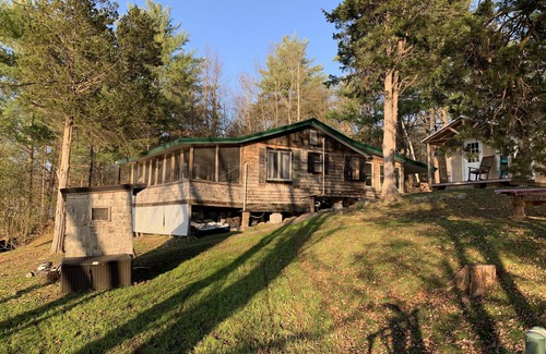 Nestled in the woods on the shores of Black Lake this small waterfront cottage is peaceful and private, offering a large screened porch to sit and watch the sunsets! It has two bedrooms and one bath in the main cottage (530 sq ft) and a separate bunk house (100 sq ft) that allows for sleeping accommodation for 7 additional guests. Kitchen and living area is open plan with a large enclosed back porch that makes a great entertaining space. Two firepits. Dock. BBQ. Peddle boat. Canoe. Lawn games. Camping atmosphere in rear of house and lake vibes in front of house. Fully stocked kitchen. Linens, towels, toiletries all provided. Washer & Dryer. Clothesline. There is access to a private boat ramp 1/4 mile away. We use this place when it isn’t rented so we have everything needed to have a relaxing lake visit. We are always improving and adding value for our guests and ourselves. **Please note that Black Lake is not ideal for swimming due to lake weeds & lake muck.** Also - This is a cottage/camp in a woodsy area on a lake. There is lots of nature around! Fish to catch, birds to watch, mosquitoes to smush… we treat for insects, pests, and critters but we do not have the ability to control Mother Nature. There will be some gnats, mosquitoes, spiders and flies around the outside of the property due to the wooded lake location. We provide mosquito repellant and bug spray. The house itself has room to sleep 6 (1 queen bed, 1 full bed, 1 queen futon) and the bunkhouse has 7 twin beds. There is a step down to access the living room, one bedroom and the porch. There is one step up to the bunkhouse. There is also an unpaved incline to reach the dock/lake. Verizon cell service works great, but there is no service with other cell providers.