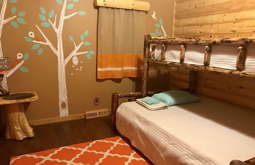 * Main level bedroom with a torched cedar log Twin XL over Queen bunk--next to the main level bathroom, which has a slate shower and stone sink, as well as new comfort height Kohler toilet.