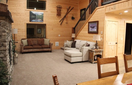 Our cabin is 1950 sq. ft. and has vaulted ceilings with Knotty Pine tongue and groove throughout giving it that rustic country feel. Hungry? After a day of adventure, come home to a kitchen that has everything you’ll need to create a home cooked meal for your family or friends, with seating for 10 available. The Living Room has a 58" SMART TV and a Blue-ray player (DVD’s are not provided), a sofa sleeper and a couch, a gas fireplace will help take the chill off at night while you enjoy a book or a family card game. A small selection of family games and books are available for your use. There is also WIFI access (password provided on-site). The Utility room has a washer and dryer for your use (please provide your own laundry soap) and ample hooks to hang wet items like bathing suits, towels, or snow pants. The Master bedroom is located off the kitchen and has a king size bed, with a TV. The Master Bathroom has a jetted tub to relax in after the days adventures. The upstairs loft is classified as the 4th bedroom with 3 twin size beds, one is a trundle bed. A perfect spot to play a quite game of chess. The 2 upstairs bedrooms have queen size beds ready for a good night’s rest after a day of hiking, fishing, and exploring. For children, we have toys, games and books as well as a portable crib, and high chair. Our Goal is to make sure our guests have the best experience possible, and to make our guests feel at home!
