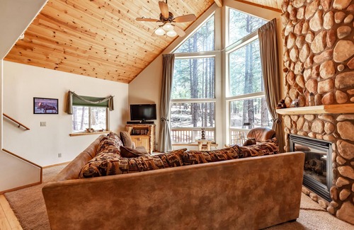 On an acre, the 1440 square foot Moose Manor sits at 7000 feet of elevation in the Tall Pines, between Flagstaff and Williams, the Gateway to the Grand Canyon. Beautifully decorated and furnished, it has two King Bedrooms, a sleeping loft with two twins and a queen futon, a comfy couch, plus a pack-and-play on request. It has two full bathrooms. It has a fully equipped kitchen, all linens, all the comforts of home, and then some. Children love the Rainbow Play Set in the back. Or, sit in front of the grand stone fireplace, and gaze out the floor-to-ceiling picture windows at the trees and wildlife.