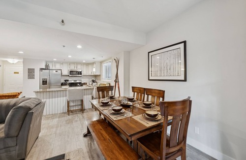 The open-concept kitchen is fully stocked with everything you need to cook, entertain, or refuel after a day of adventure. The living and dining area invite you to relax with a cozy wood-burning fireplace, comfy seating, a large TV, and direct access to your private patio—ideal for morning coffee or après-ski happy hour.