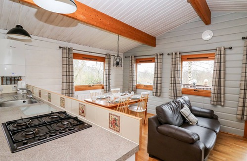 Amenities: Gas central heating with electric flame effect fire. Electric oven and gas hob, microwave, fridge, TV with Freeview, WiFi. Fuel and power inc. in rent. Bed linen and towels inc. in rent. Off-road parking for one car. Decked veranda with seating and private hot tub. Two well-behaved dogs welcome. Sorry, no smoking. Shop and pub 2.4 miles. Note: There are 13 steps to access the lodge. Please note: There is an 11 PM noise curfew at this property. Please note: Grocery shopping deliveries from local supermarkets can be delivered to reception